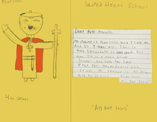 一位四年级的学生在信中画了一幅关于教宗方济各的画,并写道:“我喜欢艺术。枪击案发生时,我就在罗伯小学,我感到非常害怕。现在我转到了一所更好的学校。希望你能为我、我的家人和朋友祈祷。”该信件以圣心学校的座右铭——“一切为了耶稣”——结束。