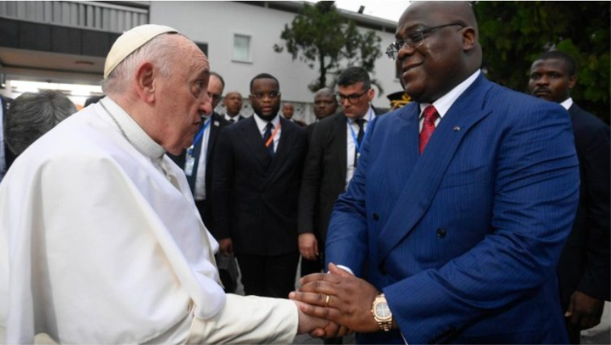 教宗坐着轮椅从机舱下来时,受到刚果民众的热烈欢迎。随后在总统府接受了欢迎仪式,然后拜见刚果总统齐塞克迪(Félix Tshisekedi),并会见民政当局、公民社会和外交使团,发表了讲话。教宗呼吁放开非洲,放开刚果民主共和国。这里不是待开发的矿山,也不是待掠夺的土地。教宗称许多大国关注非洲大陆只是为了自身的利益,为了开发其矿产资源。愿非洲成为其命运的主角。教宗谴责该国仍在遭受破坏的冲突,以及外国势力对该国巨大自然资源的鲁莽开采。