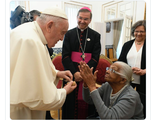 6、8月4日,教宗方济各在里斯本大使馆会见了106岁的玛利亚(Maria da Conceição Brito Mendonça)。这位老人出生于1917年5月13日,法蒂玛圣母显现的当天。