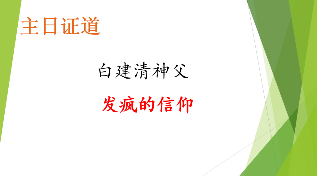 主耶稣渴望我们每一位基督徒无论在自己的日常生活中,在从事各种事业中,特别在每天的福传中都有一颗火热的心,像父母寻找丢失的孩子一样的急迫的心和发疯一样爱人的精神。当我们基督徒充满爱火,发疯爱人时,整个世界就看到了新希望,冷酷的环境也会春暖花开。