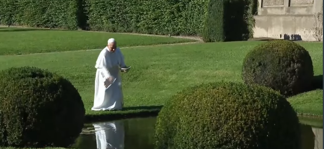 接着,教宗停留在水池前喂锦鲤鱼,欣赏池内的睡莲和花园美景。看到花园里用多种植物拼成的宗座牧徽及格言,教宗便走上台阶,仔细观赏图案。到了运用生物动力法经营的葡萄园,教宗下车问候农场工人,降福动物,其中包括几匹骏马。这一切彰显了整体生态要同时照顾受造物和人。