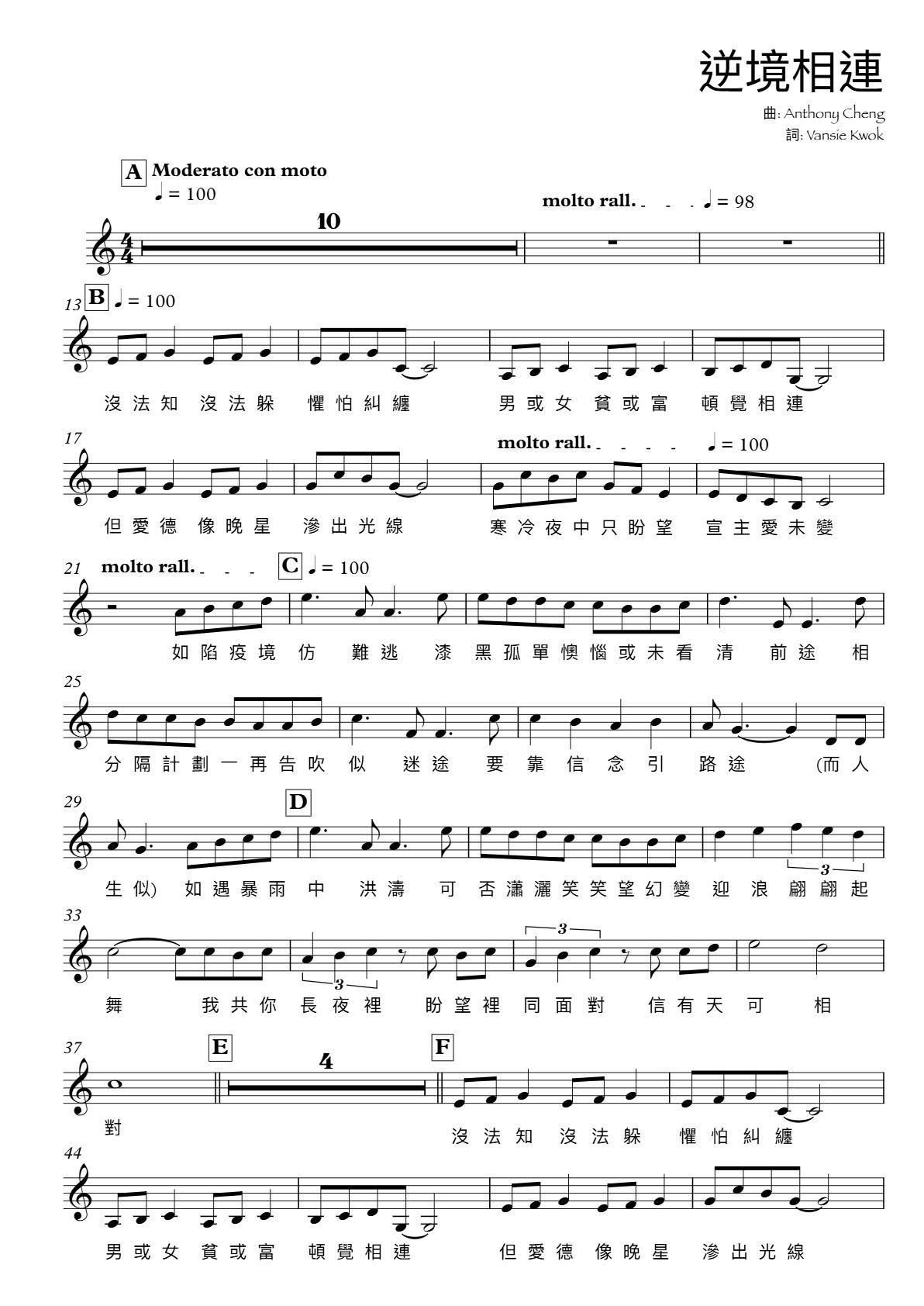 《逆境·相连》一首今年受香港教区陈志明副主教委託,鼓励在疫情中受苦的人们所创作的歌曲;作词者郭蕙漩有多年生活灵修的经验,歌词中常能表达生活和信仰深层的反省意念,歌词清楚简洁且生活化,作曲编曲者郑汝森音乐起伏生动且自由宽广,音乐气势磅薄有大将之风,鼓励处在疫情中的人们信靠天主,勇敢面对和承担。感谢作词作曲者的分享,带给我们第三届真理杯圣歌创作比赛一首意外的荣誉模范佳作!